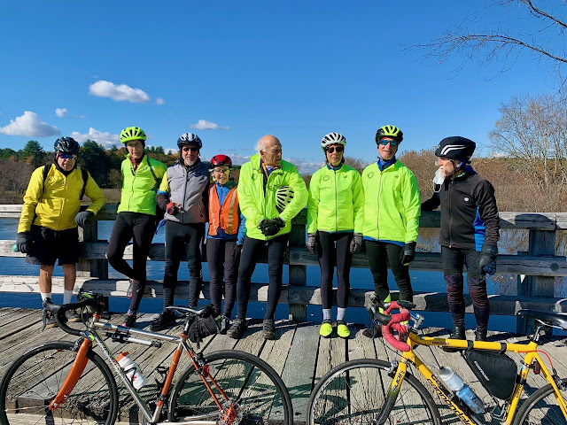 Seventeen hikers and three canines met at Red Rail Farm in Lincoln. The mention of a bicycle race track in the ride announcement caught the attention of Larry Finison, a bicycle historian, who showed up at the ride start for a brief chat.